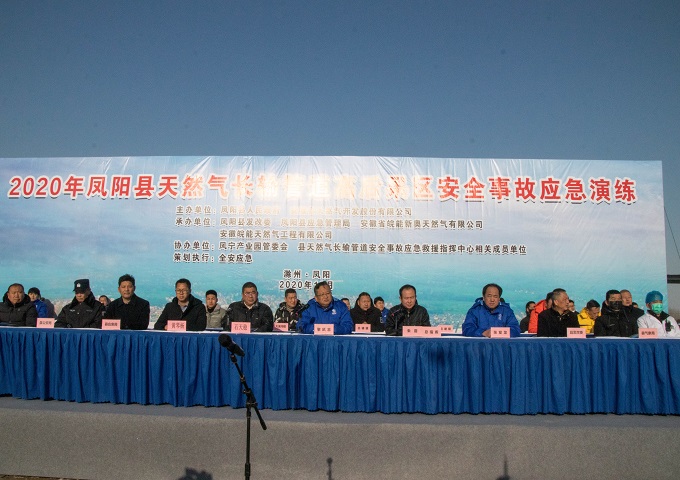12月30日下午,由凤阳县人民政府、省天然气公司主办,凤阳县发改委、凤阳县应急管理局、皖能新奥公司、皖能工程公司承办,凤宁产业园管委会、凤阳县天然气长输管道安全事故应急救援指挥中心相关成员单位协办的“2020年凤阳县天然气长输管道高后果区安全事故应急演练”在凤阳宁国现代产业园成功举行。滁州市发改委副调研员石天稳,凤阳县人民政府副县长朱震,省天然气公司党委委员、副总经理黎延志等出席演练活动。县直相关部门负责人、分管领导、燃气管理部门负责人、相关乡镇、园区负责人及相关企业负责人观摩了本次演练。