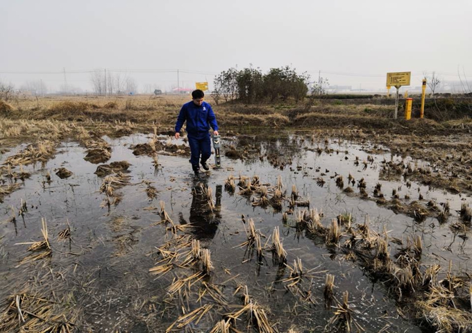 加设三桩任务不是一天两天就能完成的工作,定凤支线管道埋设地段地形错综复杂,有些地段因村民没有种植农作物,形成一片片沼泽地,上面芦苇遍布,人站在里面看不到外面的情况,脚下都是淤泥,寸步难行。为了获得准确的管道位置和埋深,彭子主动请缨,独立承担起线路三桩埋设前的定点工作。从清晨到黑夜,他冒着寒风细雨,穿着雨鞋踩在泥泞的稻田和沟渠中,寒风像一把把刀子在脸上划过,他没有退缩,一步一个脚印艰难前行,并将竹竿插上做为后续埋设标志桩的位置。管道测量完成以后,虽然穿着雨衣和靴子,但是靴子里面已经进满了水,即使这样彭子也丝毫没有停下歇息,立刻把管道相关信息向站长进行告知。
