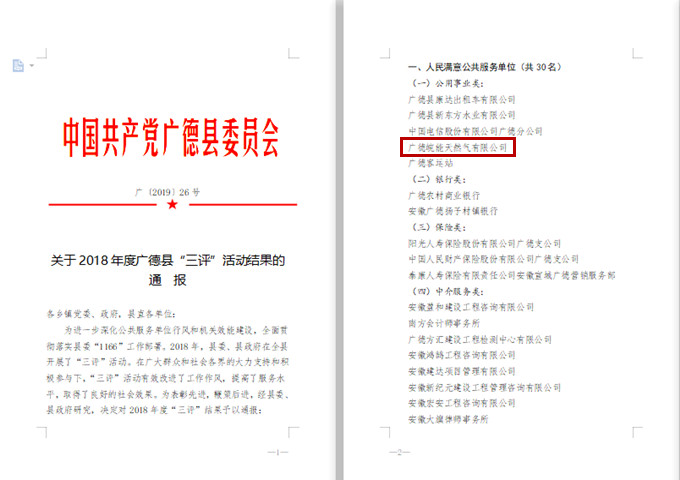 3月11日,2018年度广德县“三评”活动结果揭晓,30家单位荣获人民满意公共服务单位称号,广德皖能天然气有限公司荣登榜单。成绩的取得是广大用户对公司优质服务的认可,更是政府部门对公司行风建设的肯定。