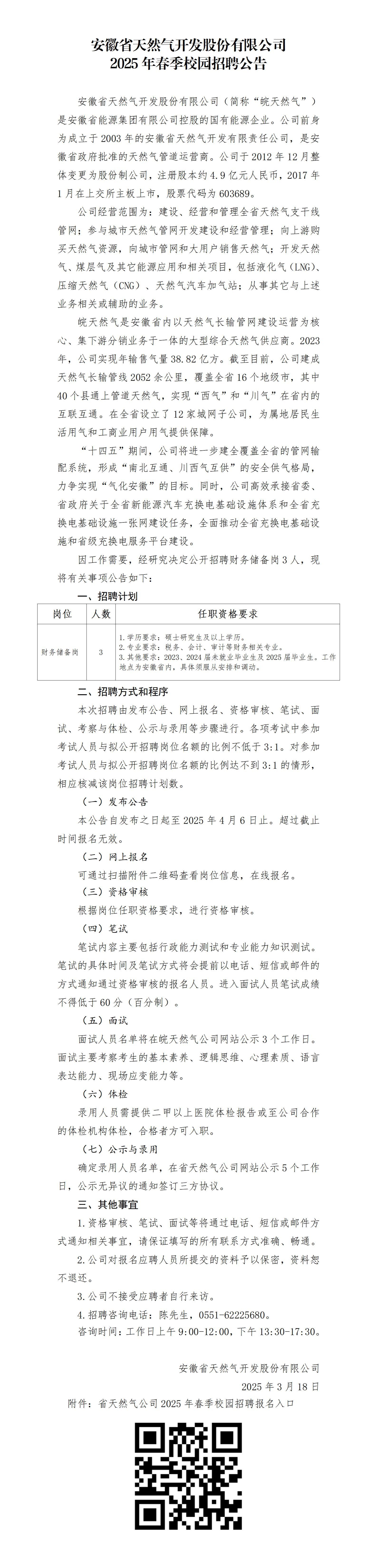 安徽省天然气开发股份有限公司2025年春季校园招聘公告
