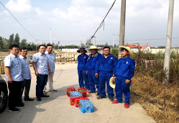 7月24日下午,室外温度36°,省天然气公司副总经理吴海赶赴工程公司合六支线肥西境内管道外检测施工现场慰问一线员工,将防暑降温物品亲手交给正冒着酷暑战斗在一线的工程公司员工手中,并对大家表示慰问,安生部、工程公司相关部门负责人陪同。
