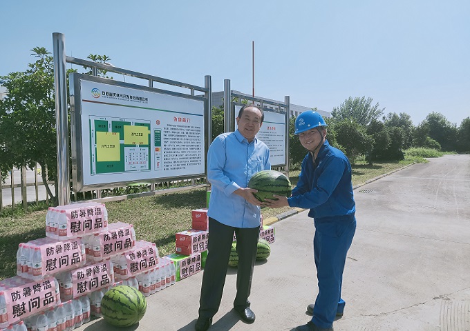 在省天然气公司龙塘输气站,贾化斌与现场一线职工亲切交流,对在炎炎夏日里奋斗在生产一线的公司职工表示感谢,并为坚守在工作岗位上的员工们送去了饮料、西瓜等降暑物品,以及夏日里的关怀和“清凉”。