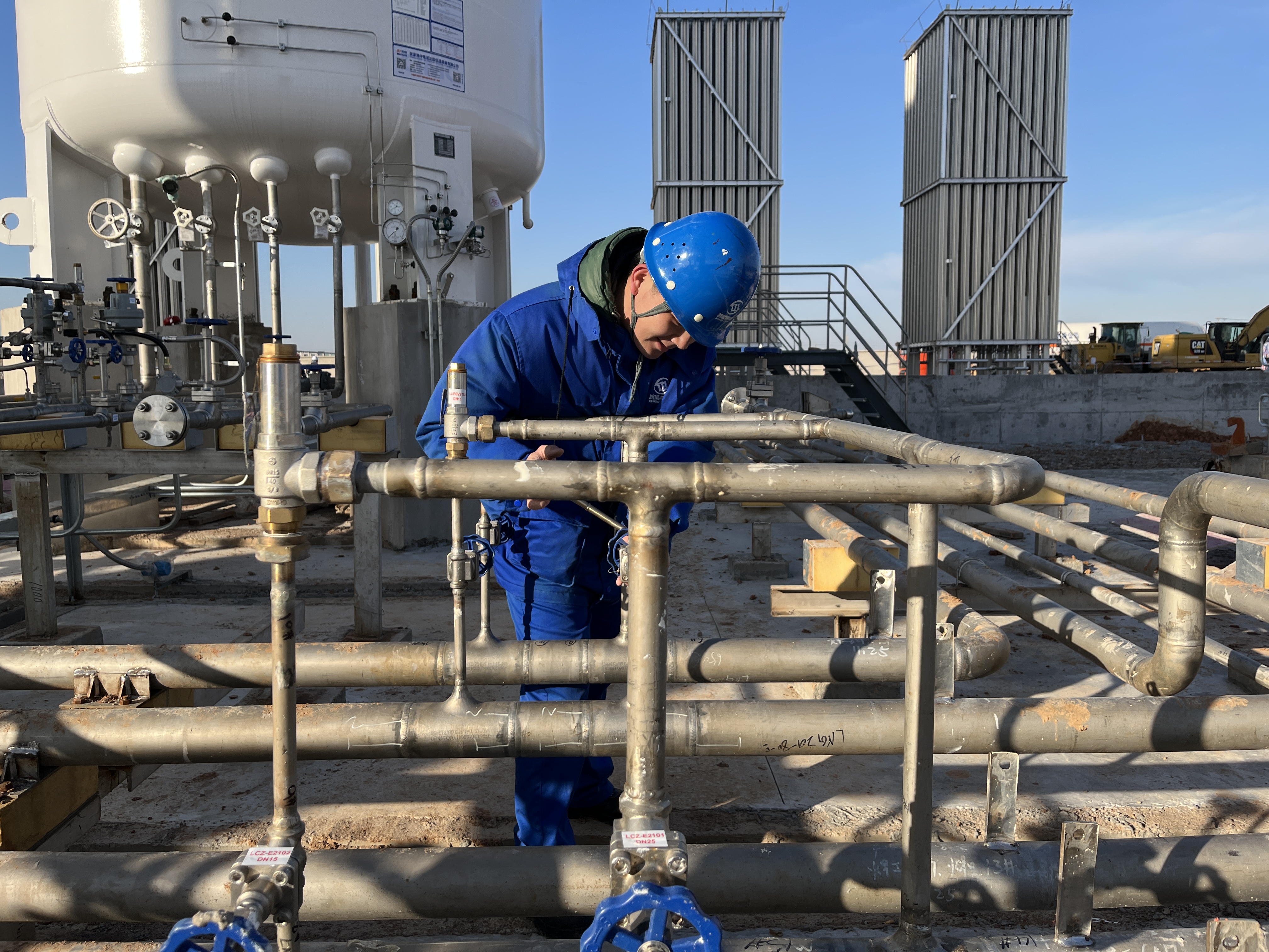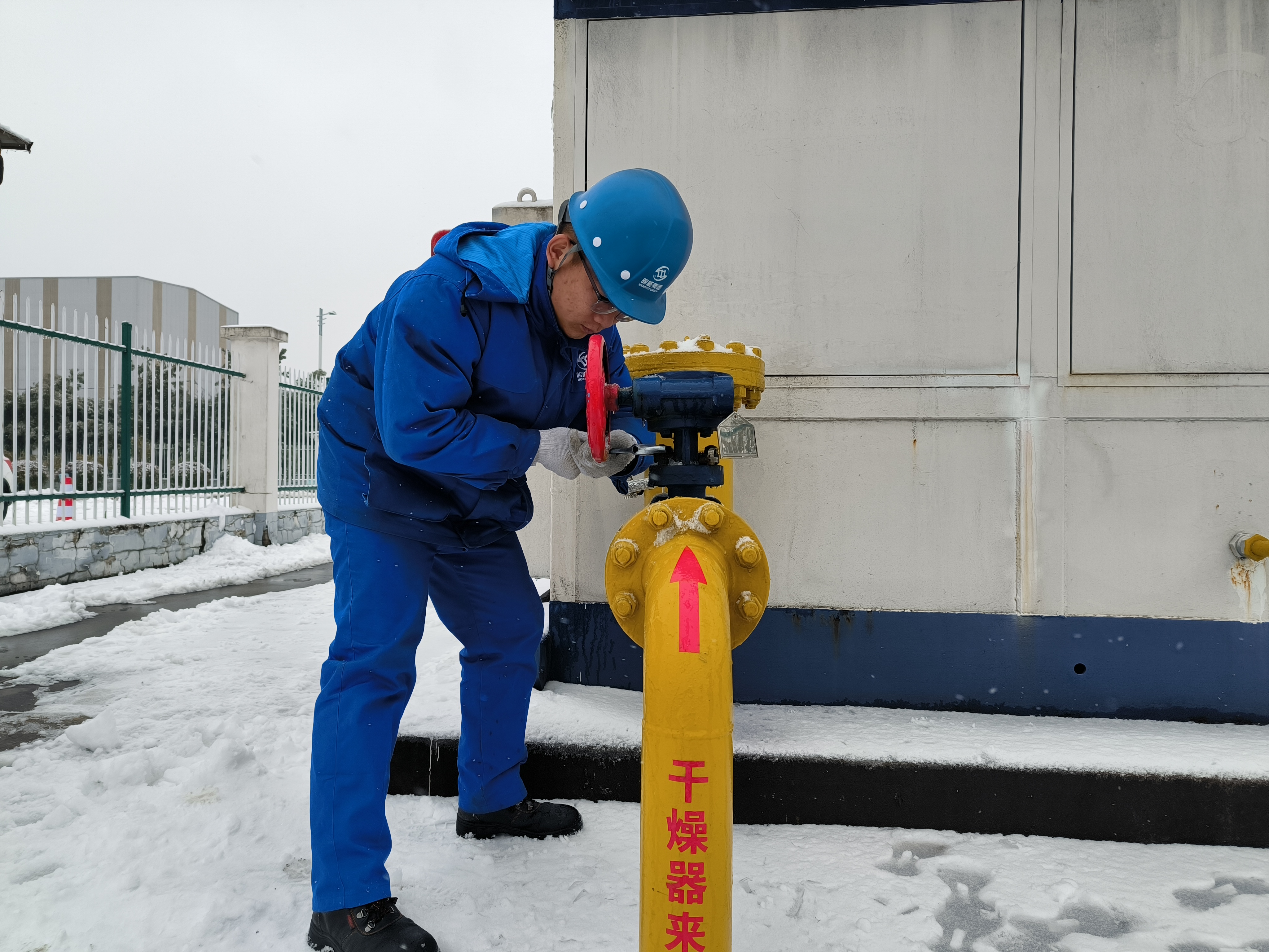 省天然气池州公司输气工张伟顶住严寒,坚守在公司北门站-LNG气化合建站项目现场,开展站内阀门检查及压力监测工作。