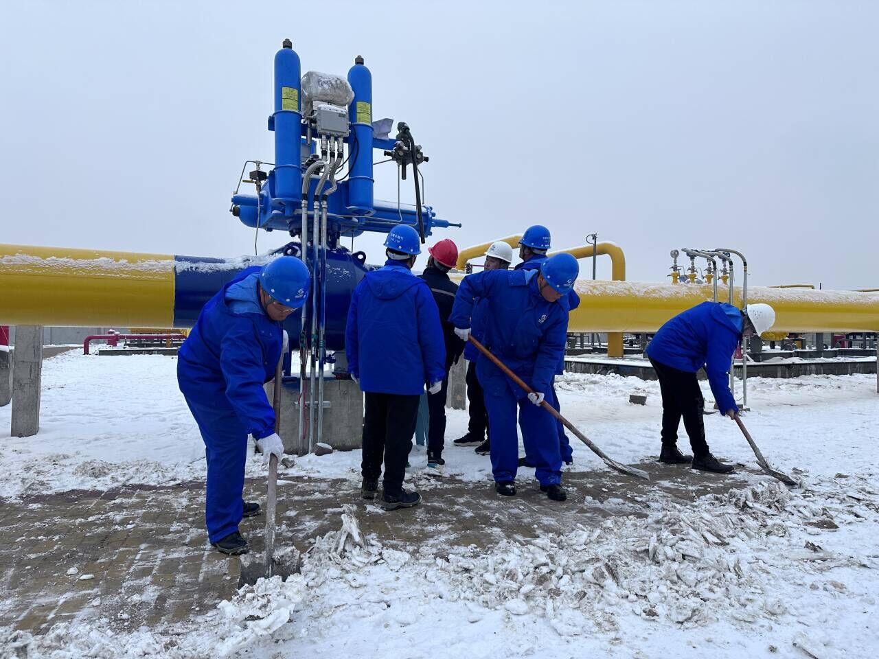 春节将至,省天然气公司工程建设中心长丰项目管理部职工全员出动,不畏严寒,在罗集输气站开展除雪工作,检查供气设备运行情况,保障雨雪天气正常供气。