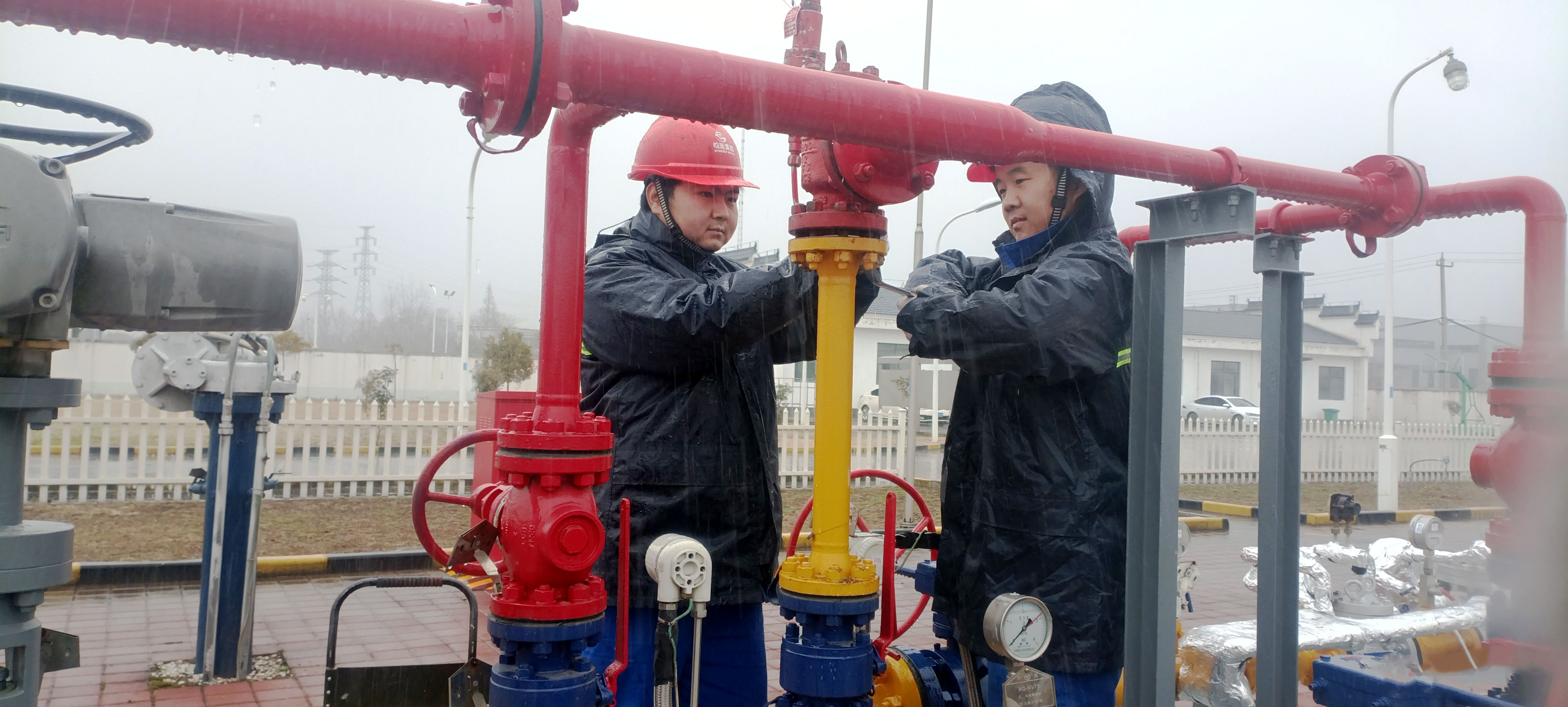面对低温雨雪天气,省天然气舒城公司安全员段中雨和输气员徐菲顶着风雨,在舒城东输气站安装跨接线,确保低温环境下管道安全平稳运行。(省天然气公司各部室、各子公司/供稿)