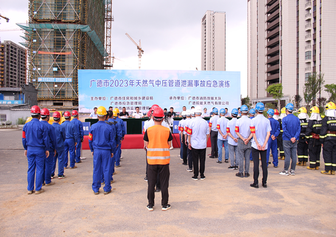 6月20日,广德市2023年天然气中压管道泄漏事故应急演练在绿地城小区附近举行,广德市副市长、党组副书记,市经济开发区主任张勇国,市经济开发区副主任、市住建局党委书记、局长杨胜怀,省天然气公司总工程师张先锋出席活动并进行指导,市市场监管局、市总工会、市消防救援大队、桐汭街道等有关部门代表现场观摩演练。