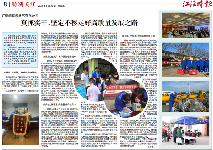 5月26日,《江淮时报》用半幅版面长篇刊发《广德皖能天然气有限公司:真抓实干,坚定不移走好高质量发展之路》一文。