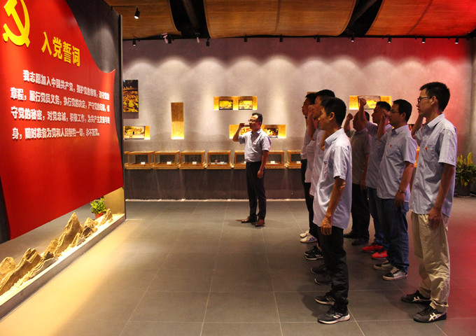 鲜艳的党旗下,入党誓言响彻展馆大厅,全体党员在领誓人的带领下,高举右手,面向党旗庄严宣誓:“我志愿加入中国共产党,拥护党的纲领,遵守党的章程,履行党员义务……”他们声音铿锵坚定,表达了为共产主义事业奋斗终身的决心和信心。