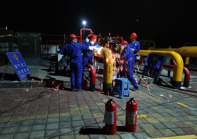 沈巷站肩负当地两家燃气公司的供气使命,在近期压力管道定期检验中,检验人员发现沈巷出站管段两道焊缝存在缺陷,需紧急改造修复。为确保供气安全,维抢修中心连夜搭建临时旁通管道,对缺陷部位进行置换隔离后焊接修复。
