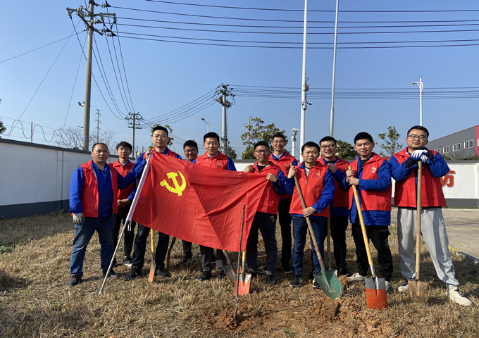 上午8点,大家准备好树苗、铁锹、锄头、水桶等工具,集体出发前往LNG气化站。党员、团员、青年员工们三两成队,齐心协力,挖坑、埋树、垫土、浇水等动作一气呵成。在迎风飘扬的党旗下,整齐排列的一棵棵树苗在春风中摇曳。