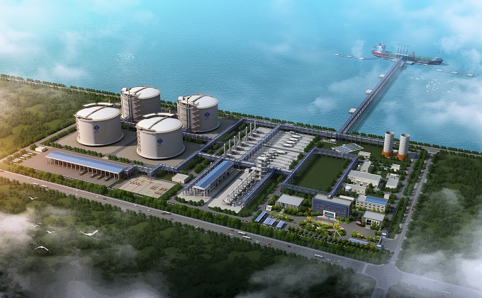 江苏如东“阳光岛”,四面环海,如东LNG接收站就坐落在此。航拍图上,四个20万立方米的“巨型”罐体十分显眼,长长的廊桥连接着码头,大型LNG船只驶向海洋深处。