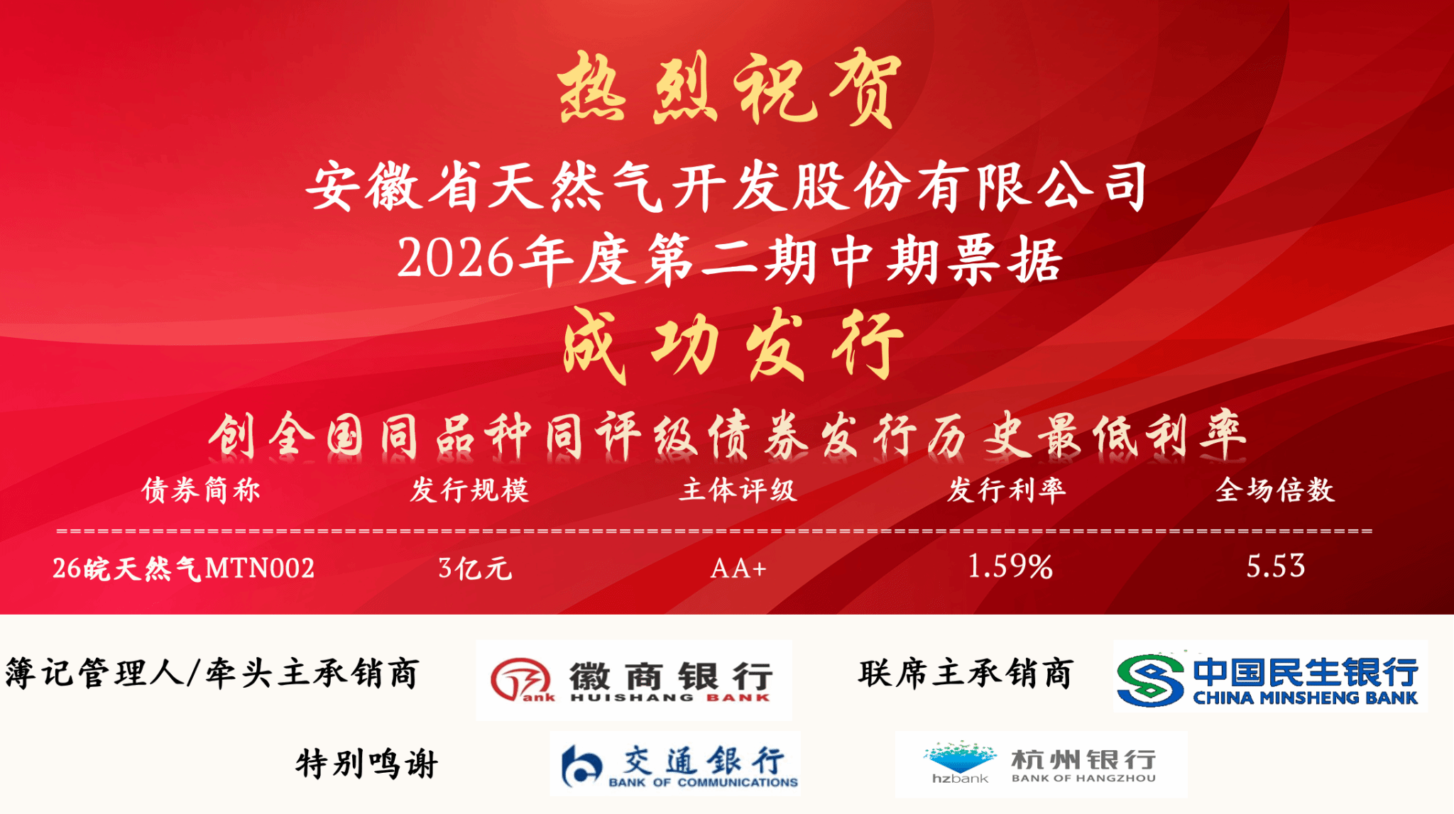 4月8日,省天然气公司在银行间债券市场成功发行2026年第二期中期票据,发行规模3亿元人民币,期限380天,票面利率1.59%,创全国同品种同评级债券发行历史最低利率。全场认购倍数达到5.53倍,体现了资本市场对公司信用资质和未来发展前景的高度认可。