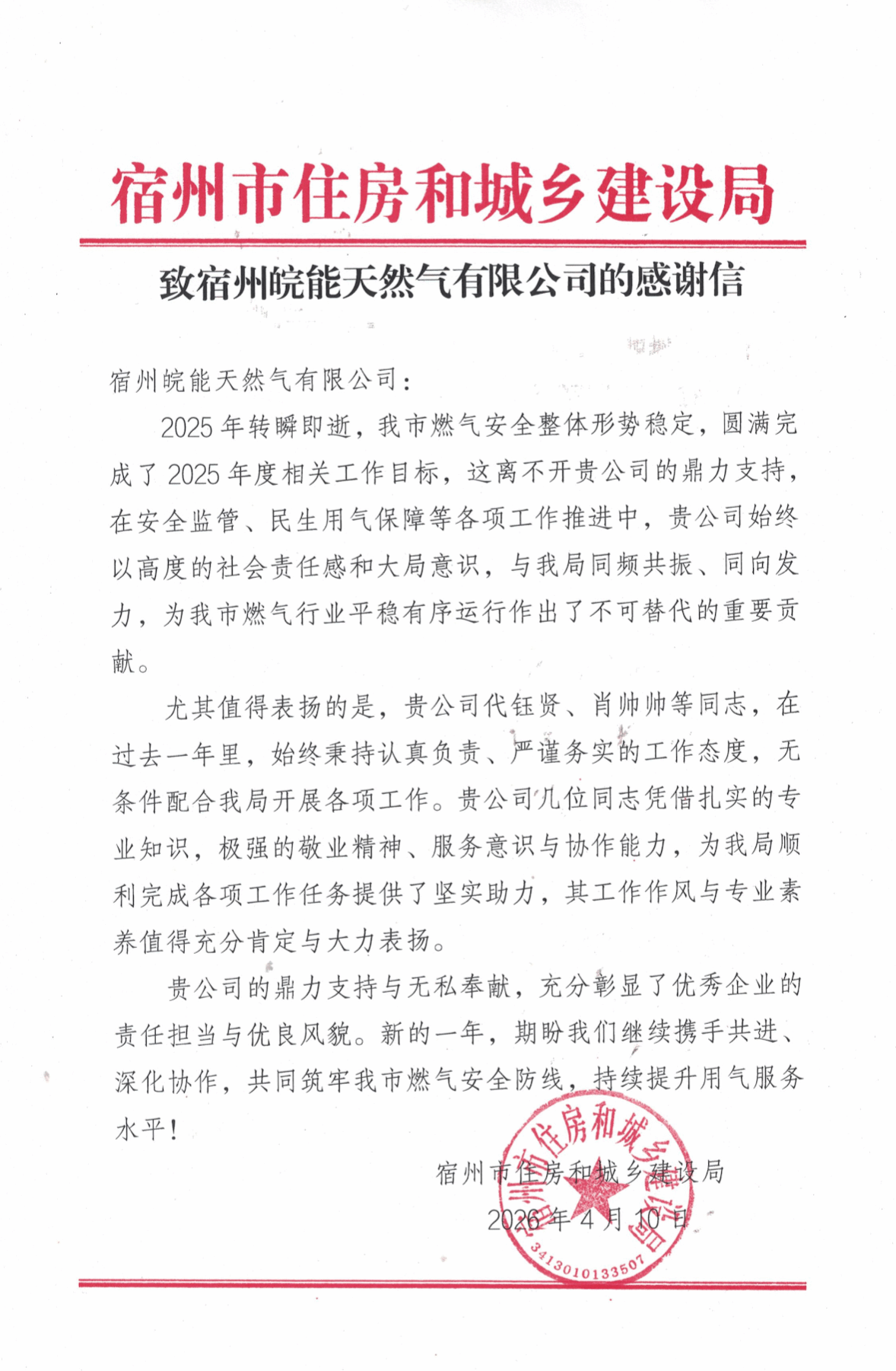 4月13日,宿州公司收到宿州市住房和城乡建设局发来的感谢信,信中对公司在2025年度的燃气安全监管、民生用气保障等工作中所作出的重要贡献给予高度评价,同时对公司代钰贤、肖帅帅等同志的认真负责和严谨务实的工作态度提出表扬。