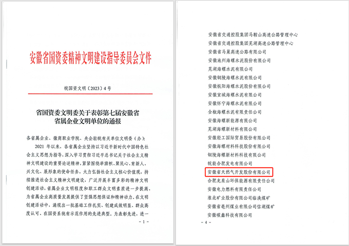 近日,安徽省国资委精神文明建设指导委员会发布了《省国资委文明委关于表彰第七届安徽省省属企业文明单位的通报》,授予安徽省天然气开发股份有限公司第七届安徽省省属企业文明单位荣誉称号。