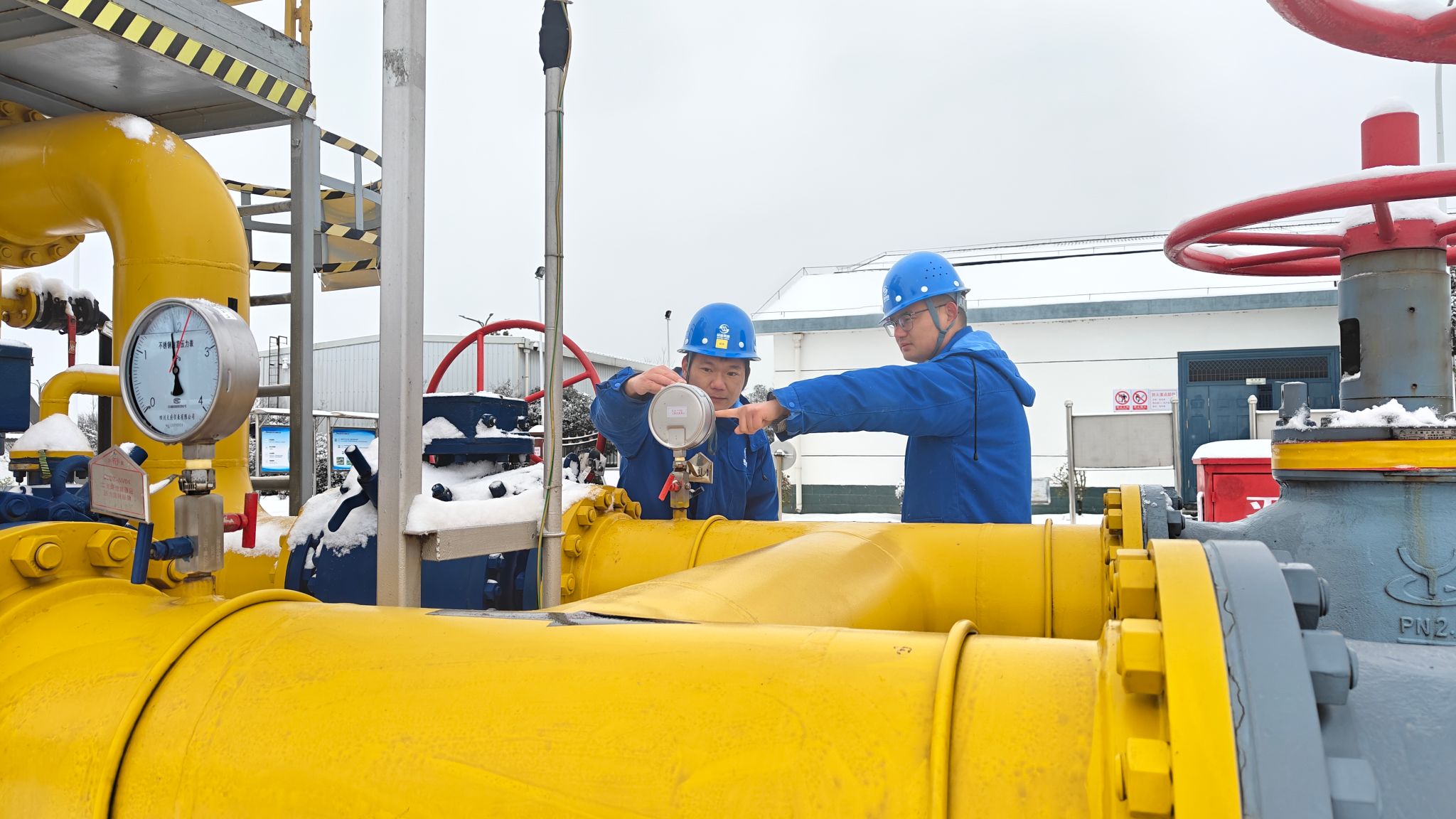 现场寒风凛冽,调压站区域最低气温降至零下,凛冽的寒风裹挟着霜雪打在工作人员脸上、身上,但全体保供人员毫无怨言、坚守岗位,顶风冒雪开展管线巡检、设备维护,以“顶得住严寒、扛得起责任”的实干劲头,用坚守与担当抵御寒潮侵袭,用专业与高效守护万家温暖。