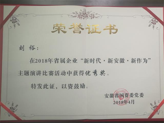 近日,由安徽省国资委党委举办的2018年省属企业“新时代·新安徽·新作为”主题演讲比赛圆满落下帷幕,经过激烈角逐,皖天然气压缩公司刘裕荣获“优秀奖”的佳绩。