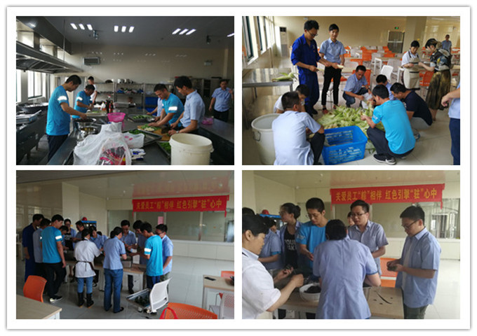 下午2:30,在压缩公司总经理徐后勇宣布包粽子开始,活动拉开序幕,包粽子在食堂大厅有条不紊的进行着,修建粽叶、包粽子、剪绳子、装粽子……,像是车间流水线,但是这里充满了大家的欢笑声和讨论声。此时,厨房间也忙成一片,洗菜、切菜、配菜、配料、烧菜……,不是专业却胜似专业,桌上一盘盘的热菜——红烧排骨、红烧肉、木耳肉片、家常小炒、凉拌黄瓜、土豆牛肉……,看者目不暇接,听着垂涎欲滴!大家甚至忘了厨房间的温度,忙着交流烧菜的心得,厨房间充满着热气、笑声、温度,其乐融融。