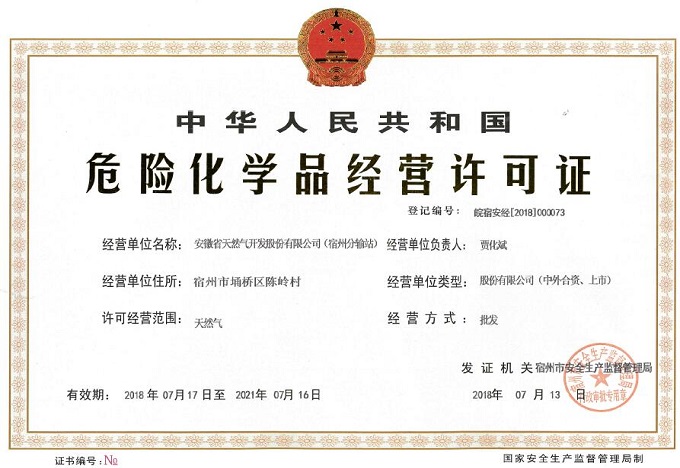 近日,省天然气公司传来喜讯,宿州分输站危险化学品经营许可证换证工作圆满结束。
