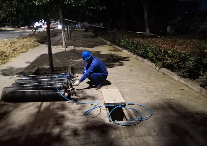 首先,工作人员按照流程组织了置换方案交底、作业区域检查、风险辨识等工作,当置换所用氮气按时送达现场,一切准备就绪后,现场领导小组总指挥一声令下,置换作业正式开始。从关阀到注氮、从放散到检测…每个环节都有条不紊。监护组、检测组、应急组…每个单位都井然有序,密切配合。由于置换管线长、管径大,当检测可燃气体含量为8.5%左右时,置换进入一个瓶颈期。同志们全然不顾渐渐转暗的天色,忘却了下班的时间,不急不躁缓慢注入置换氮气,耐心地观察燃气含量一点一点的降下来,GMI检测仪检测的可燃气体含量终于达到合格标准。在施工单位和监理员确认浓度合格过后,施工人员迅速断开管帽、焊接弯头,很快完成了碰口作业。此时参与置换的同志们依然没有放松警惕,配合施工人员对焊口质量进行检测,等焊口检测合格并完全冷却后注入剩余氮气,进行通气前最后一次保压。