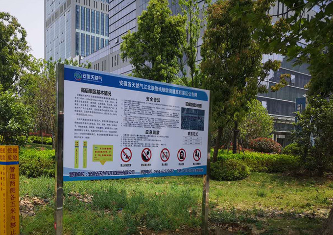 高后果区是天然气管道泄漏后可能对公众和环境造成较大不良影响的区域,高后果区管理是管道管理的重中之重。公告牌详细标注了天然气管道高后果区概况、输送介质、危险性、应急措施、监督电话以及具体负责人等信息,安装位置醒目,能更好的对沿线居民进行宣传警示。