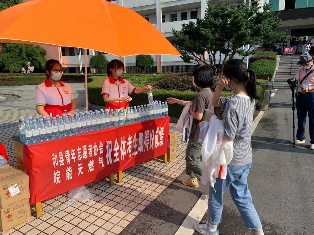 在鲜艳团旗下,穿着红色志愿者服的和县公司共青团员们和其他单位青年团员一同向广大考生和家长发放百余口罩、3000余瓶矿泉水、500余把扇子、2000包纸巾等防疫防暑用品。志愿服务之余宣贯燃气安全知识,讲解天然气法律规范,诠释皖能企业文化理念,鼓舞考生助力信心,现场欢声笑语不断,与充满青春激情和热心服务的“绿丝带”共同飘扬。同时公司青年突击队加强对和城考生家庭的燃气安全维护服务,最快速度解决考生家庭燃气报修问题,确保为考生创造良好的家庭环境。