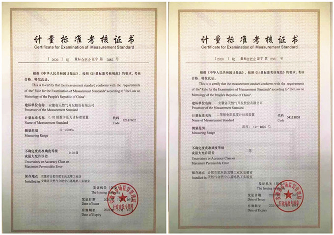 12月23日,省天然气公司顺利取得安徽省市场监督管理局核发的《计量标准考核证书》。此证书的取得标志着省天然气公司具备了非贸易计量压力、温度仪表的自行检定/校准资格,是公司计量管控的跨越性进步,也是公司成立热工实验室以来在业务能力扩展方面取得的重要突破。