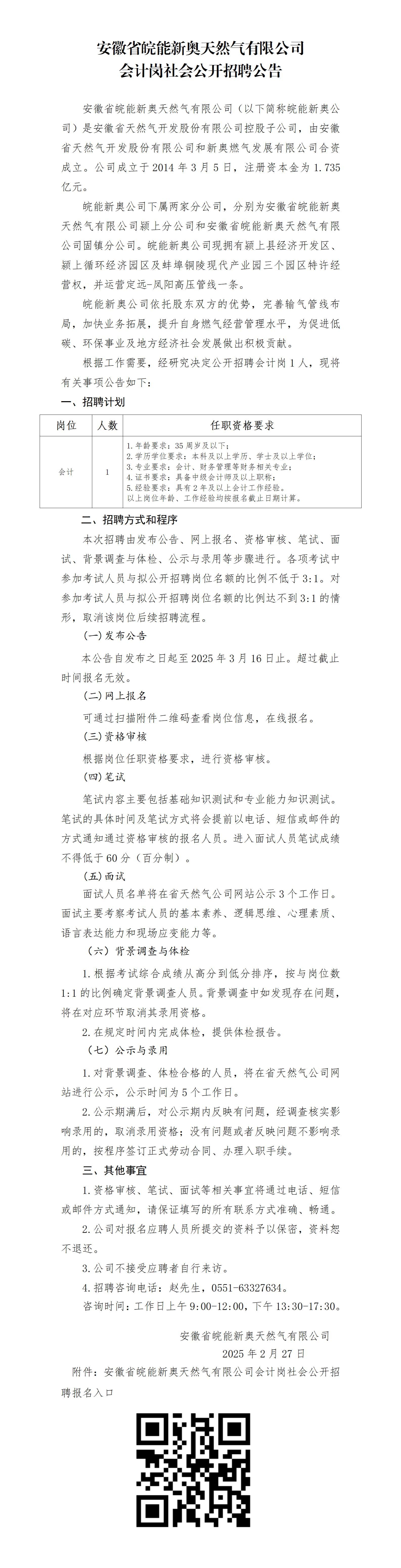 安徽省皖能新奥天然气有限公司会计岗社会公开招聘公告