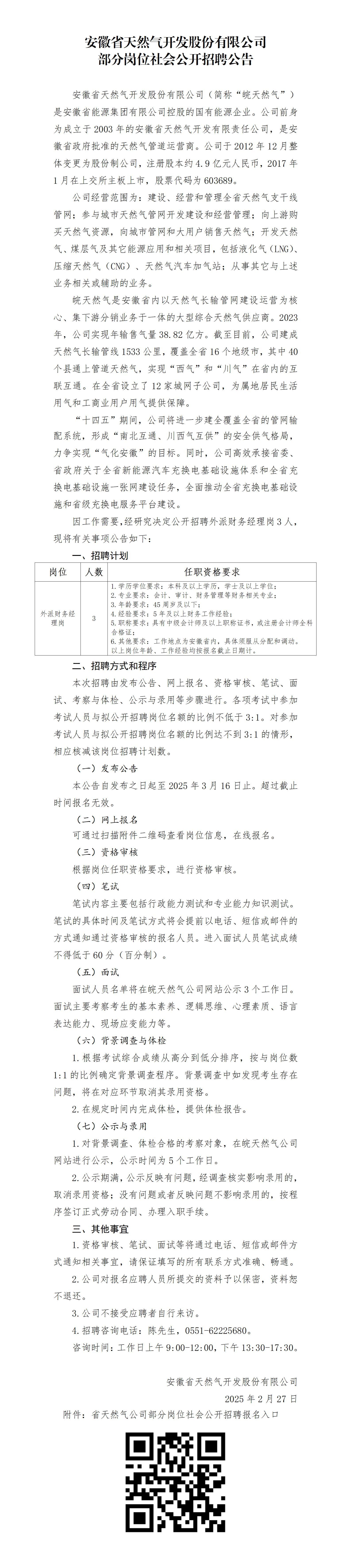 下一条:安徽省皖能新奥天然气有限公司会计岗社会公开招聘公告
