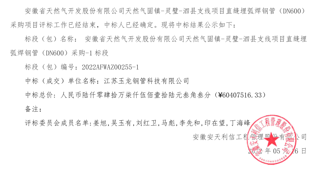 下一条:安徽省天然气开发股份有限公司天然气固镇-灵璧-泗县支线项目直缝埋弧焊钢管(DN600)2标段中标结果公告